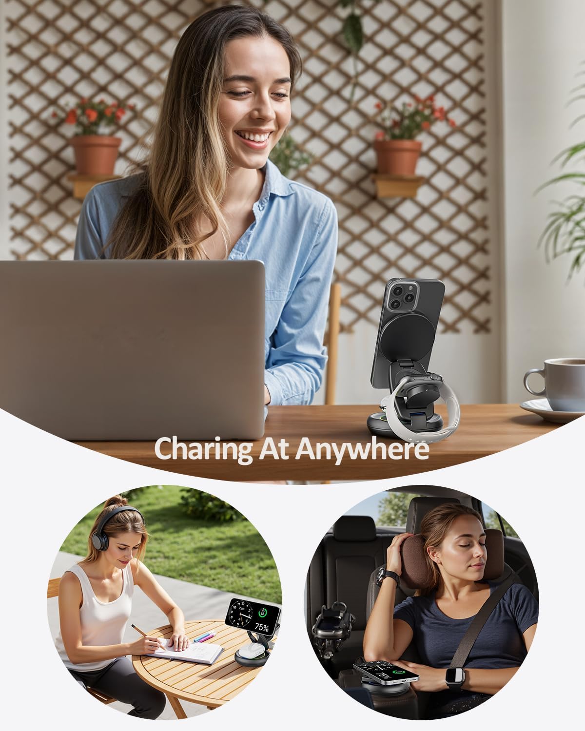 Why choose 3-in-1 wireless phone charger? For this mag-safe charger station, after studying a lot of data, we designed this style. It combines the advantages of wireless charging and avoids the disadvantages. This magnetic wireless charger 3 in 1 is worth taking home, it'sIdeal size,small and lightweight,multi-dimensional use,efficient and convenient.Use it to charging for your iPhone, iWatch and AirPods.It will be the choice for everyday use and traveling. Wide Compatibility: Apple wireless charger can a wide range of devices at the same time with;it with iPhone 16/15/14/13/12 series;13/12Mini;iWatch Ultra/SE/10/9/8/7/6/5/4/3/2, Air Pods 2/3/4/Pro /Pro 2(with magnetic of devices);15 W adapter for fast charging without harming your phone Warmly Note: Please make sure your device supports wireless charging before use. Please avoid charging with case thickness more than > 2MM When the working temperature exceeds 122°F, the charging will be interrupted to avoid damage to the devices. It is only compatible with iPhone 12 and above models. If you are using a model earlier than iPhone 12, a magnetic phone case is required. The 3-in-1 Charging Station is not compatible with Samsung watches.